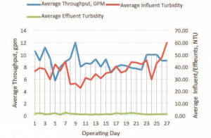 • 處理結(jié)果:平均流速=15gpm,原水濁度=28~180,產(chǎn)水SDI<3,平均通量=20gfd,平均回收率>90%